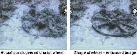 Roda de 6 raios com eixo. Um detector de metais submarino acusou presença de ferro nesta formação próxima da costa egípcia