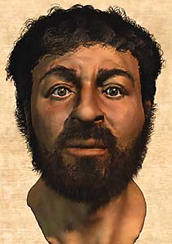 | A ilustração da aparência provável de Jesus, moreno e de cabelos crespos, é muito diversa da iconografia a seu respeito e também da face que aparece no Santo Sudário. À direita, uma reconstituição da crucificação do jovem judeu Yehohanan, cujo esqueleto é o único encontrado até hoje em Jerusalém de alguém submetido a esse tipo de execução | |